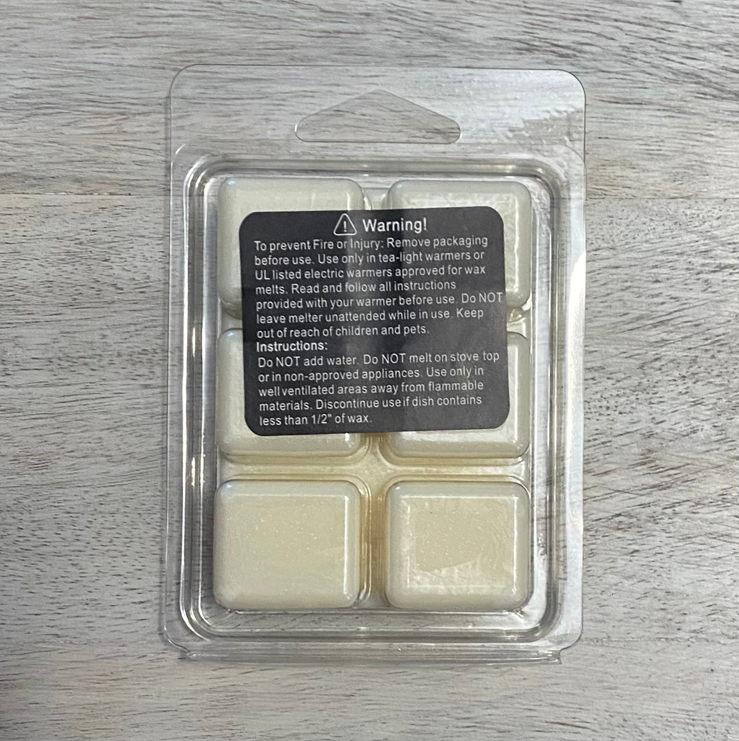 Do NOT add water. Do NOT melt on stove top or non-approved appliances. Use only in well ventilated areas away from flammable materials. Discontinue use if dish contains less than 1/2" of wax.