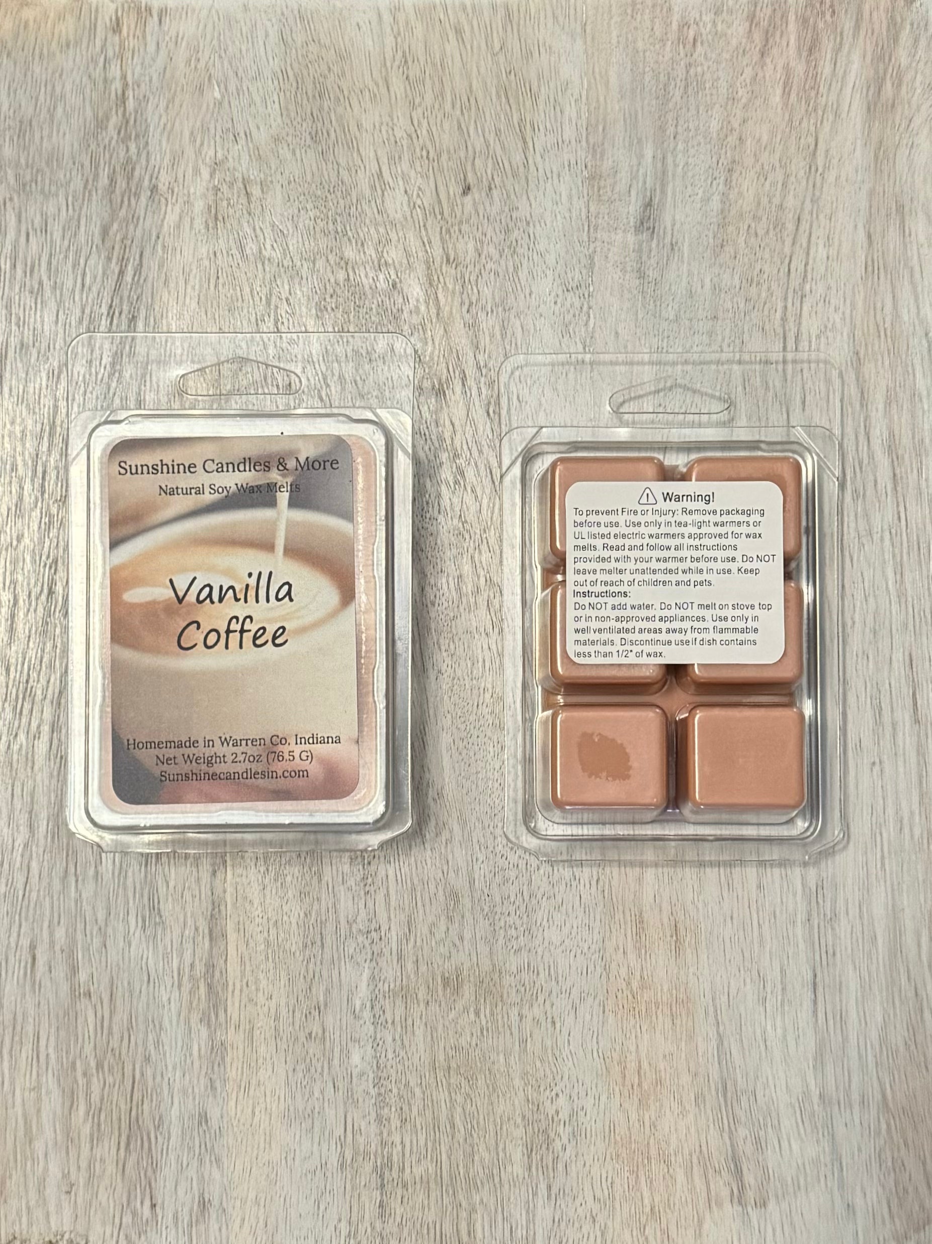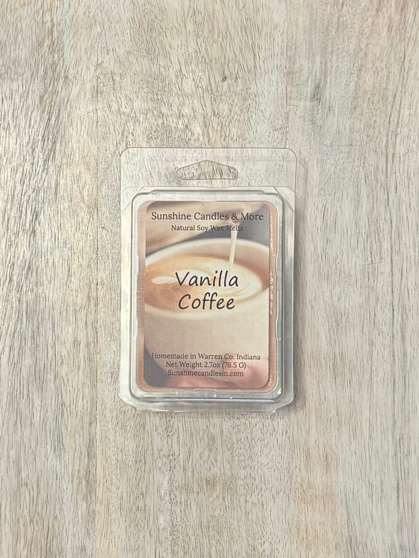 Introducing our Vanilla Coffee Wax Melts, a symphony of sweet cinnamon, buttery caramel, and fresh coffee with creamy coconut milk and whipped vanilla cream.